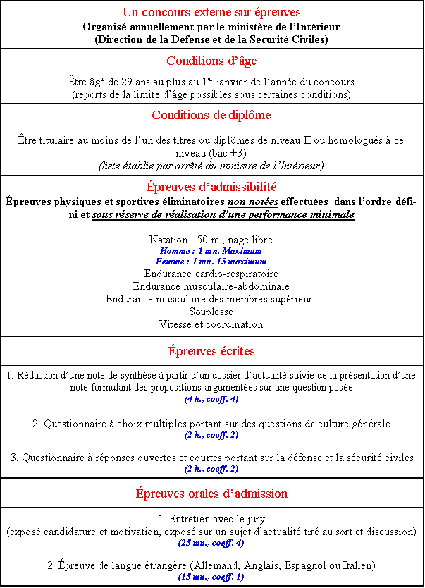 Présentation synthétique des modalités du concours externe de lieutenant de sapeur-pompier professionnel (officier) (application au 1er janvier 2002)